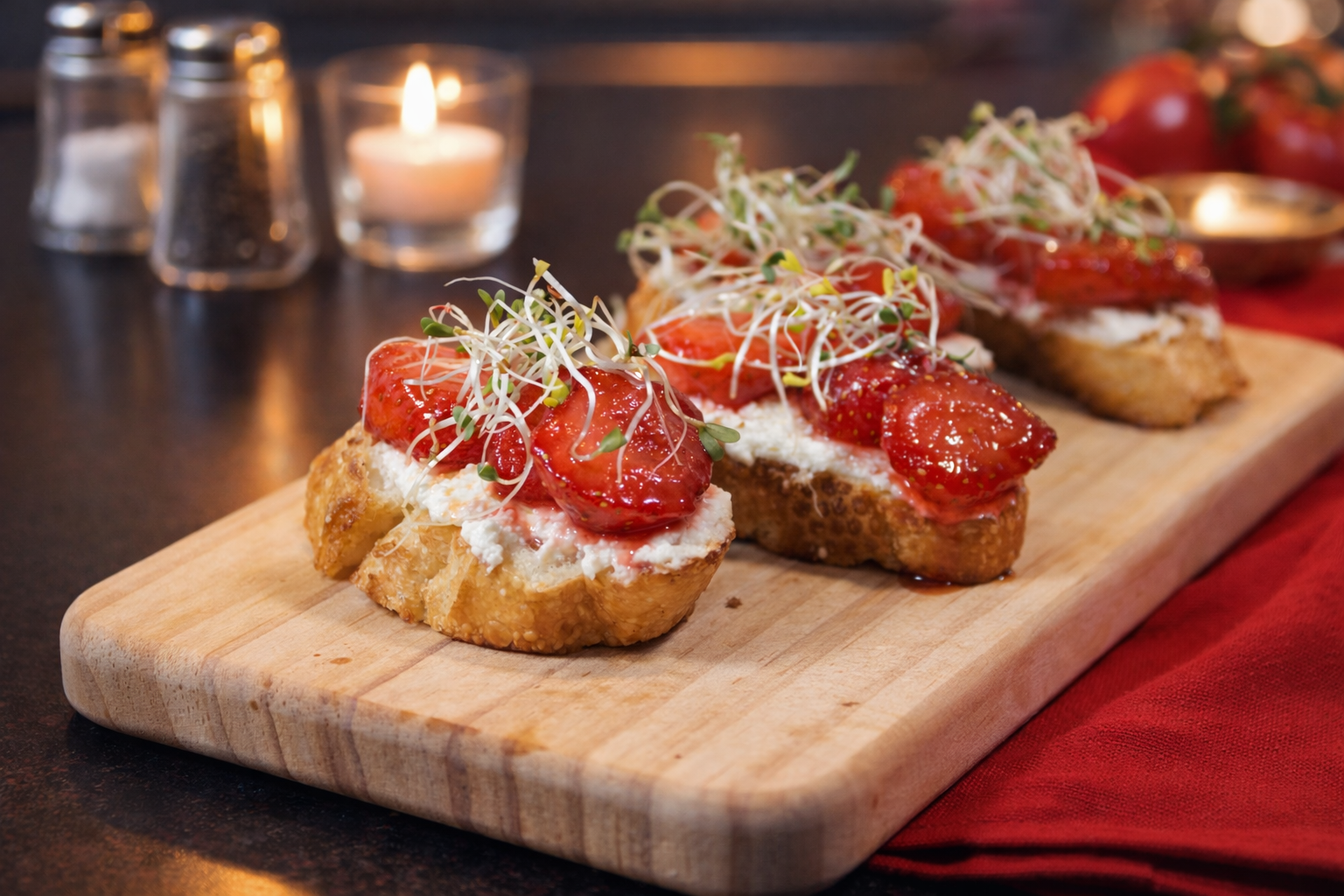 Toast de ricotta, fresas asadas y germinado de alfalfa amaranto
